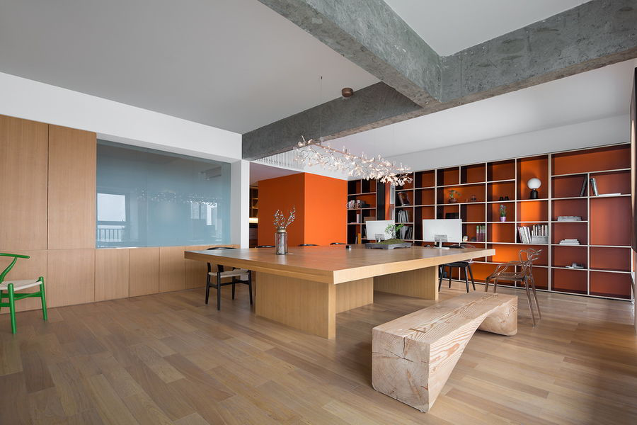 切換一個(gè)角度看看會(huì)議室內(nèi)部,整體以木材為裝飾主材,地面上淺淡的木地板配上木質(zhì)造型長凳,就算在討論時(shí)觀點(diǎn)再激烈,就算會(huì)議時(shí)間再冗長也能讓人放松下來。因?yàn)槟?,夠溫和?/p>