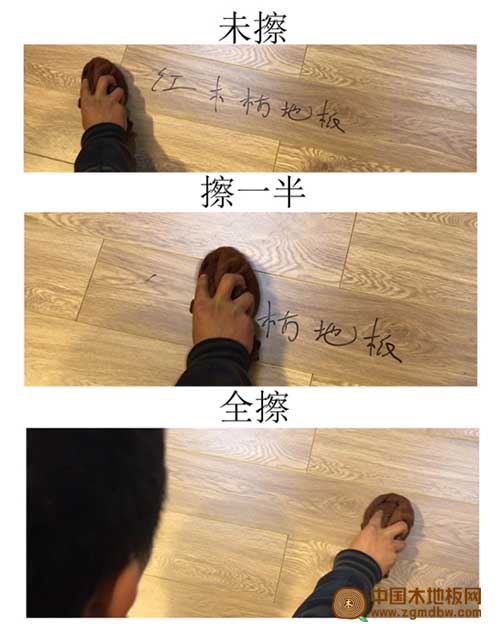 測試人員用黑色記號筆在地板上寫上“紅木枋地板”的字樣,再用抹布輕輕擦拭,很輕松得就抹掉了黑色記號筆的痕跡,地板表面沒有留下任何痕跡。