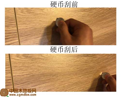 測試人員用一枚一元硬幣在地板上反復刮擦,無論輕重與否,地板表面沒有出現(xiàn)起皮、劃痕等現(xiàn)象,表面依舊如新,完美無瑕。經(jīng)測試可以發(fā)現(xiàn),地板耐磨性可見一斑。